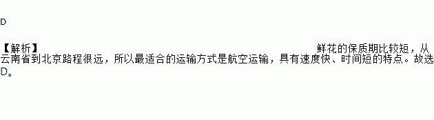 D 【解析】鲜花的保质期比较短,从云南省到北京路程很远,所以最适合的运输方式是航空运输,具有速度快、时间短的特点。故选D。
