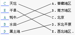 解答:解:青藏地区主要的牲畜是牦牛,南方地区耕地类型是水田,天坛位于北京,东北平原是黑土地,西北地区气候干旱.根据题意.