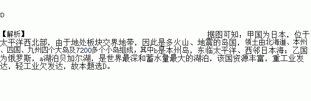 B. 乙国的a湖泊是世界最深和蓄水量最大的湖泊