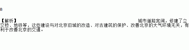B 【解析】城市道路宽阔,修建了立交桥、地铁等,这些建设与对北京旧城的改造、对古建筑的保护、改善北京的大气环境无关,有利于改善北京的交通。