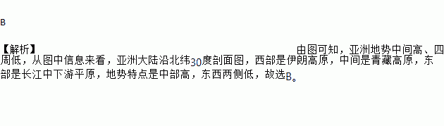 B 【解析】由图可知,亚洲地势中间高、四周低,从图中信息来看,亚洲大陆沿北纬30度剖面图,西部是伊朗高原,中间是青藏高原,东部是长江中下游平原,地势特点是中部高,东西两侧低,故选B。
