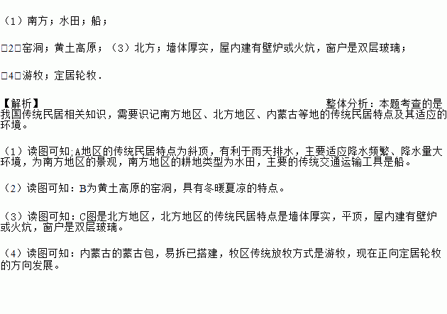 (1)南方;水田;船; (2)窑洞;黄土高原;(3)北方;墙体厚实,屋内建有壁炉或火炕,窗户是双层玻璃; (4)游牧;定居轮牧. 【解析】整体分析:本题考查的是我国传统民居相关知识,需要识记南方地区、北方地区、内蒙古等地的传统民居特点及其适应的环境。 (1)读图可知;A地区的传统民居特点为斜顶,有利于雨天排水,主要适应降水频繁、降水量大环境,为南方地区的景观,南方地区的耕地...