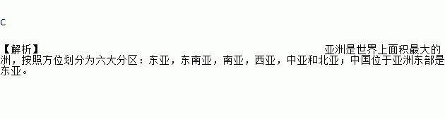 C 【解析】亚洲是世界上面积最大的洲,按照方位划分为六大分区:东亚,东南亚,南亚,西亚,中亚和北亚;中国位于亚洲东部是东亚。