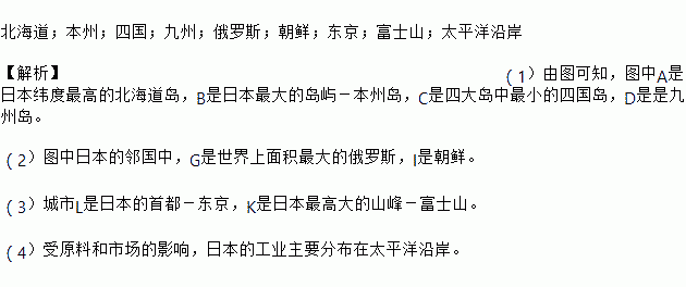 北海道;本州;四国;九州;俄罗斯;朝鲜;东京;富士山;太平洋沿岸 【解析】(1)由图可知,图中A是日本纬度最高的北海道岛,B是日本最大的岛屿-本州岛,C是四大岛中最小的四国岛,D是是九州岛。 (2)图中日本的邻国中,G是世界上面积最大的俄罗斯,I是朝鲜。 (3)城市L是日本的首都-东京,K是日本最高大的山峰-富士山。 (4)受原料和市场的影响,日本的工业主要分布在太平洋沿岸...