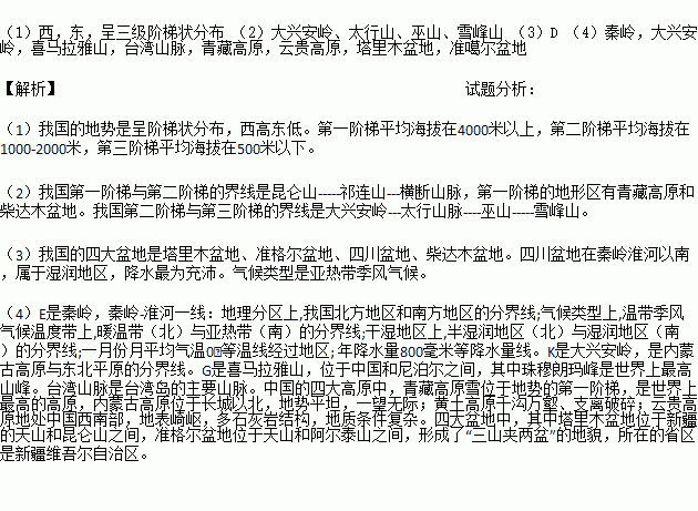 (2)我国地势第二、三阶梯的分界线 、 、 和 。