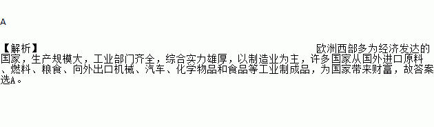 A 【解析】欧洲西部多为经济发达的国家,生产规模大,工业部门齐全,综合实力雄厚,以制造业为主,许多国家从国外进口原料、燃料、粮食、向外出口机械、汽车、化学物品和食品等工业制成品,为国家带来财富,故答案选A。