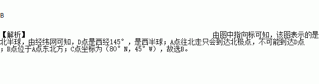 C. B点位于A丹东北方 D. C点坐标为(80°N,45°W)
