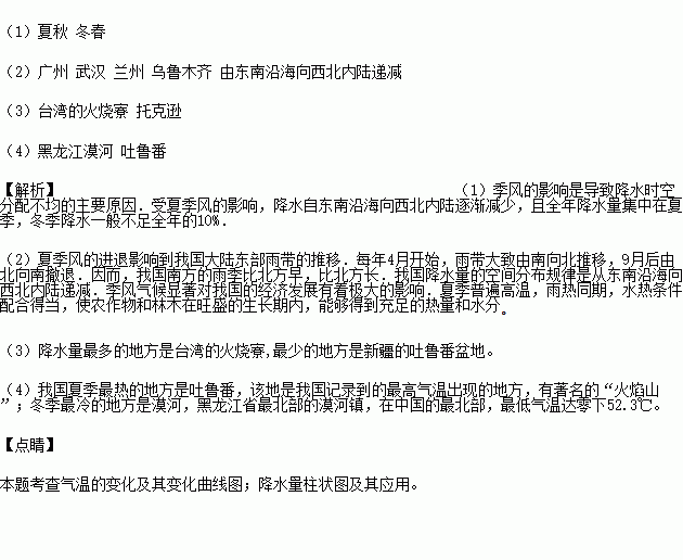 (3)我国降水最多的地方__________,降水最少的地方_________。