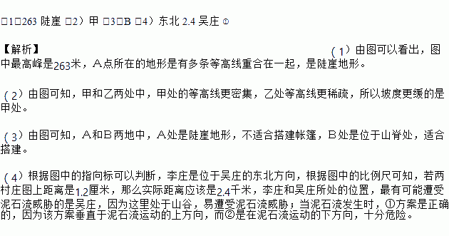 (1)263 陡崖 (2)甲 (3)B (4)东北 2.4 吴庄 ① 【解析】(1)由图可以看出,图中最高峰是263米,A点所在的地形是有多条等高线重合在一起,是陡崖地形。 (2)由图可知,甲和乙两处中,甲处的等高线更密集,乙处等高线更稀疏,所以坡度更缓的是甲处。 (3)由图可知,A和B两地中,A处是陡崖地形,不适合搭建帐篷,B处是位于山脊处,适合搭建。 (4)根据图中的指...