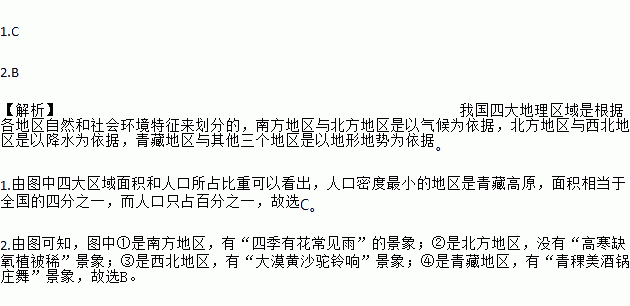 1.C 2.B 【解析】我国四大地理区域是根据各地区自然和社会环境特征来划分的,南方地区与北方地区是以气候为依据,北方地区与西北地区是以降水为依据,青藏地区与其他三个地区是以地形地势为依据。 1.由图中四大区域面积和人口所占比重可以看出,人口密度最小的地区是青藏高原,面积相当于全国的四分之一,而人口只占百分之一,故选C。 2.由图可知,图中①是南方地区,有“四季有花常见雨”...