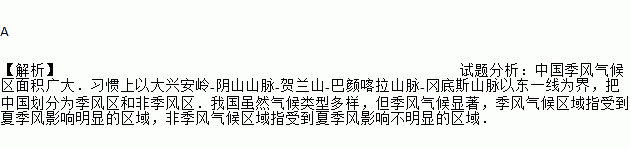 A ¡¾½âÎö¡¿ÊÔÌâ·ÖÎö£ºÖйú¼¾·çÆøºòÇøÃæ»ý¹ã´ó£®Ï°¹ßÉÏÒÔ´óÐ˰²Áë-ÒõɽɽÂö-ºØÀ¼É½-°ÍÑÕ¿¦ÀɽÂö-¸Ôµ×˹ɽÂöÒÔ¶«Ò»ÏßΪ½ç£¬°ÑÖйú»®·ÖΪ¼¾·çÇøºÍ·Ç¼¾·çÇø£®ÎÒ¹úËäÈ»ÆøºòÀàÐͶàÑù£¬µ«¼¾·çÆøºòÏÔÖø£¬¼¾·çÆøºòÇøÓòÖ¸Êܵ½Ïļ¾·çÓ°ÏìÃ÷ÏÔµÄÇøÓò£¬·Ç¼¾·çÆøºòÇøÓòÖ¸Êܵ½Ïļ¾·çÓ°Ïì²»Ã÷ÏÔµÄÇøÓò£®