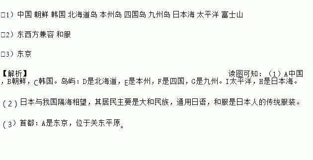 (1)中国 朝鲜 韩国 北海道岛 本州岛 四国岛 九州岛 日本海 太平洋 富士山 (2)东西方兼容 和服 (3)东京 【解析】读图可知:(1)A中国,B朝鲜,C韩国。岛屿:D是北海道,E是本州,F是四国,G是九州。I太平洋,H是日本海。 (2)日本与我国隔海相望,其居民主要是大和民族,通用日语,和服是日本人的传统服装。 (3)首都:A是东京,位于关东平原。 ...