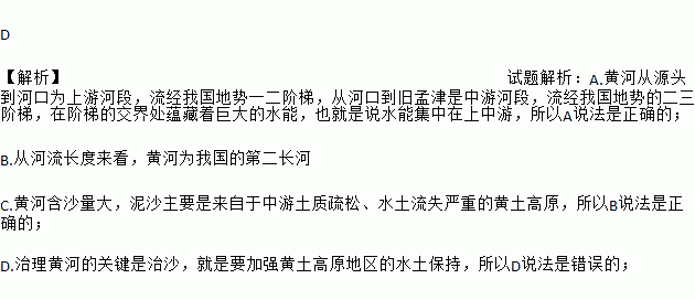 D ¡¾½âÎö¡¿ÊÔÌâ½âÎö£ºA.»ÆºÓ´ÓÔ´Í·µ½ºÓ¿ÚΪÉÏÓκӶΣ¬Á÷¾ÎÒ¹úµØÊÆÒ»¶þ½×ÌÝ£¬´ÓºÓ¿Úµ½¾ÉÃϽòÊÇÖÐÓκӶΣ¬Á÷¾ÎÒ¹úµØÊƵĶþÈý½×ÌÝ£¬ÔÚ½×ÌݵĽ»½ç´¦Ô̲Ø×ž޴óµÄË®ÄÜ£¬Ò²¾ÍÊÇ˵ˮÄܼ¯ÖÐÔÚÉÏÖÐÓΣ¬ËùÒÔA˵·¨ÊÇÕýÈ·µÄ£» B.´ÓºÓÁ÷³¤¶ÈÀ´¿´£¬»ÆºÓΪÎÒ¹úµÄµÚ¶þ³¤ºÓ C.»ÆºÓº¬É³Á¿´ó£¬ÄàɳÖ÷ÒªÊÇÀ´×ÔÓÚÖÐÓÎÍÁÖÊÊèËÉ¡¢Ë®ÍÁÁ÷ʧÑÏÖØµÄ»ÆÍÁ¸ßÔ£¬ËùÒÔB˵·¨ÊÇÕýÈ·µÄ£» D.ÖÎÀí»ÆºÓµÄ¹Ø¼üÊÇÖÎɳ£¬¾ÍÊÇÒª¼Ó...