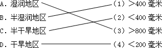 (2)将下列干湿地区与其降水量、植被景观用线连接起来.