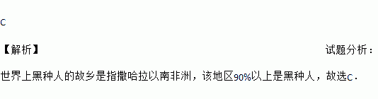 C 【解析】试题分析: 世界上黑种人的故乡是指撒哈拉以南非洲,该地区90%以上是黑种人,故选C.