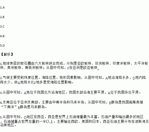 1.A 2.B 3.C 4.B 5.D 【解析】 1.地球表层的岩石圈由六大板块拼合而成,分别是亚欧板块、非洲板块、印度洋板块、太平洋板块、美洲板块、南极洲板块;从图中可知,F在亚洲是欧亚板块。 2.气候主要受到纬度位置,海陆位置,地形因素影响,从图中可知,A地沿海降水多,D地内陆降水少,故A地降水比F地多是受海陆位置影响。 3.从图中可知,A地位于...