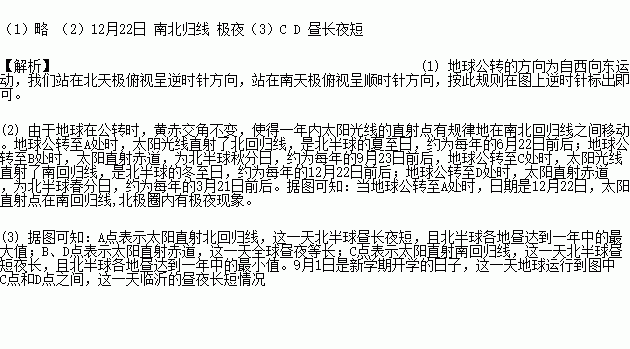 (2)µ±µØÇò¹«×ªÖÁA´¦Ê±£¬ÈÕÆÚÊÇ_______£¬Ì«ÑôÖ±ÉäµãÔÚ__________,±±¼«È¦ÄÚÓÐ___________ÏÖÏó¡£