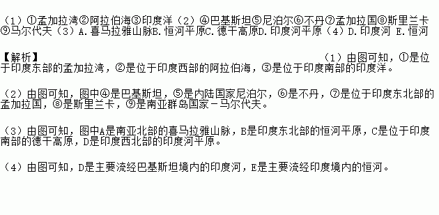 (1)①孟加拉湾②阿拉伯海③印度洋(2)④巴基斯坦⑤尼泊尔⑥不丹⑦孟加拉国⑧斯里兰卡⑨马尔代夫(3)A.喜马拉雅山脉B.恒河平原C.德干高原D.印度河平原(4)D.印度河 E.恒河 【解析】(1)由图可知,①是位于印度东部的孟加拉湾,②是位于印度西部的阿拉伯海,③是位于印度南部的印度洋。 (2)由图可知,图中④是巴基斯坦,⑤是内陆国家尼泊尔,⑥是不丹,⑦是位于印度东北部的孟加拉国,⑧是...