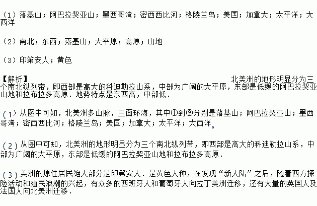 (1)落基山;阿巴拉契亚山;墨西哥湾;密西西比河;格陵兰岛;美国;加拿大;太平洋;大西洋 (2)南北;东西;落基山;大平原;高原;山地 (3)印第安人;黄色 【解析】北美洲的地形明显分为三个南北纵列带,即西部是高大的科迪勒拉山系,中部为广阔的大平原,东部是低缓的阿巴拉契亚山地和拉布拉多高原.地势特点是东西高,中部低. (1)从图中可知,北美洲多山脉,三面环海,其中①到⑨分别...