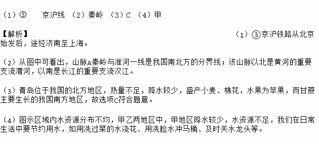 £¨1£©¢Û¾©»¦Ïß £¨2£©ÇØÁë £¨3£©C £¨4£©¼× ¡¾½âÎö¡¿£¨1£©¢Û¾©»¦Ìú·´Ó±±¾©Ê¼·¢ºó£¬Í¾¾¼ÃÄÏÖÁÉϺ£¡£ £¨2£©´ÓͼÖпɿ´³ö£¬É½ÂöAÇØÁëÓë»´ºÓÒ»ÏßÊÇÎÒ¹úÄϱ±·½µÄ·Ö½çÏߣ»¸ÃɽÂöÒÔ±±ÊǻƺӵÄÖØÒªÖ§Á÷μºÓ£¬ÒÔÄÏÊdz¤½µÄÖØÒªÖ§Á÷ºº½¡£ £¨3£©ÇൺλÓÚÎÒ¹úµÄ±±·½µØÇø£¬ÈÈÁ¿²»×㣬½µË®½ÏÉÙ£¬Ê¢²úСÂó¡¢ÃÞ»¨£¬Ë®¹ûΪƻ¹û£¬¶ø¸ÊÕáÖ÷ÒªÉú³¤µÄÎÒ¹úÄÏ·½µØÇø£¬¹ÊÑ¡ÏîC·ûºÏÌâÒâ¡£ £¨4£©Í¼Ê¾ÇøÓòÄÚË®...