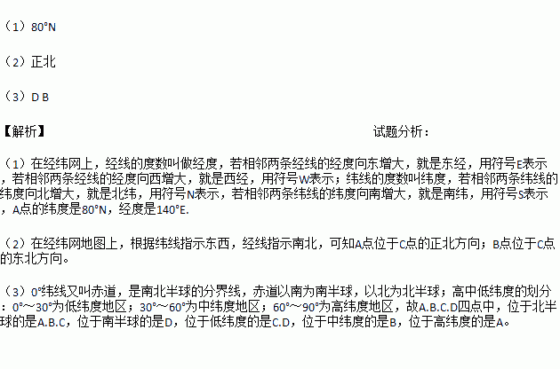 (3)B.D点中,位于南半球的是 ,位于北半球的是 。