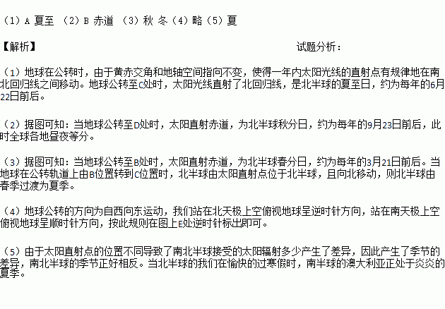 (3)当地球在公转轨道上由B位置转到C位置时,北半球由 季过渡到 季。