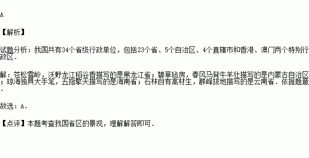 2005年的春晚有一大亮点,以对联的形式描绘我国各省区的突出亮点,例如,①苍松雪岭,沃野龙江稻谷香;②碧草毡房,春风马背牛羊壮;③琼海独具大手笔,五指擎天;④石林自有高材生,群峰拔地.以上四幅对联描写的是( )
