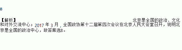 B ¡¾½âÎö¡¿±±¾©ÊÇÈ«¹úµÄÕþÖΡ¢ÎÄ»¯ºÍ¶ÔÍâ½»Á÷ÖÐÐÄ£»2017 Äê 3 Ô£¬È«¹úÕþеÚÊ®¶þ½ìµÚËĴλáÒéÔÚ±±¾©ÈËÃñ´ó»áÌÃÕÙ¿ª£¬ËµÃ÷±±¾©ÊÇÈ«¹úµÄÕþÖÎÖÐÐÄ£¬¹Ê´ð°¸Ñ¡B¡£