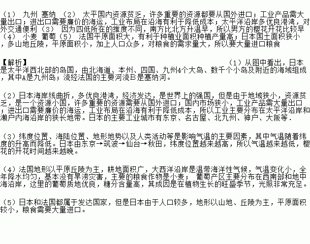 £¨1£© ¾ÅÖÝ ÈûÄÉ £¨2£© ̫ƽ¹úÄÚ×ÊԴƶ·¦£¬Ðí¶àÖØÒªµÄ×ÊÔ´¶¼Òª´Ó¹úÍâ½ø¿Ú£»¹¤Òµ²úÆ·Ðè´óÁ¿³ö¿Ú£»½ø³ö¿ÚÐèÒªÁ®¼ÛµÄº£ÔË£¬¹¤Òµ²¼¾ÖÔÚÑØº£ÓÐÀûÓÚ½µµÍ³É±¾£»Ì«Æ½ÑóÑØ°¶¶àÓÅÁ¼¸ÛÍ壬¶ÔÍ⽻ͨ±ãÀû £¨3£© ÒòΪËĵÍËùÔÚµÄά¶È²»Í¬£¬ÄÏ·½±È±±·½ÉýÎÂÔ磬ËùÒÔÄз½µÄÓ£»¨¿ª»¨±È½ÏÔ磨4£© СÂó ÆÏÌÑ£¨5£© ·¨¹úƽÔÃæ»ý´ó£¬ÓÐÀûÓÚÖÖÖ²ÒµÃæ»ýÖÖÖ²²úÁ¿¸ß£»ÈÕ±¾¹úÍÁÃæ»ýÏÁС£¬¶àɽµØÇðÁ꣬ƽÔÃæ»ýС£¬¼ÓÉÏÈË¿ÚÖڶ࣬¶ÔÁ¸Ê³µÄÐèÇóÁ¿´ó...