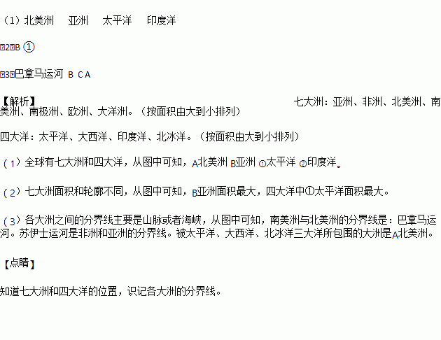 (3)南美洲与北美洲的分界线是:________。苏伊士运河是_________和__________的分 界线(填字母)。被太平洋、大西洋、北冰洋三大洋所包围的大洲是____(填字母).