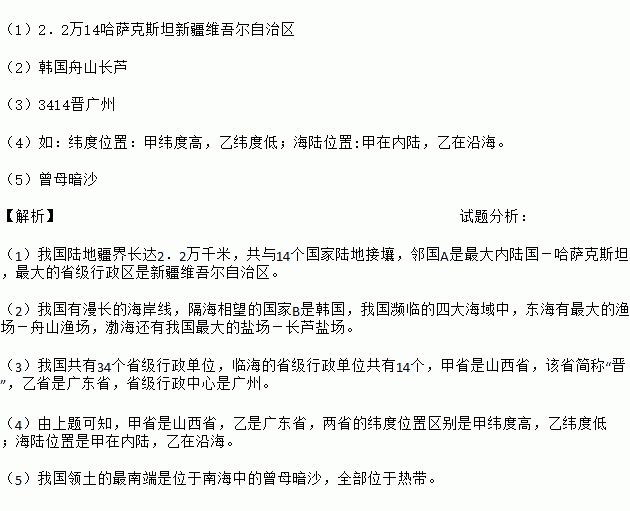 (1)2.2万14哈萨克斯坦新疆维吾尔自治区 (2)韩国舟山长芦 (3)3414晋广州 (4)如:纬度位置:甲纬度高,乙纬度低;海陆位置:甲在内陆,乙在沿海。 (5)曾母暗沙 【解析】试题分析: (1)我国陆地疆界长达2.2万千米,共与14个国家陆地接壤,邻国A是最大内陆国-哈萨克斯坦,最大的省级行政区是新疆维吾尔自治区。 (2)我国有漫长的海岸线,隔海相...