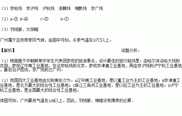 第16届亚运会将于2010年11月12日至27日在我国广州举行,朝鲜某中学生代表团将前往广州观看亚运会的开幕式。他们计划先到辽宁省沈阳,然后考察了解我国沿海四大工业基地、亲身体验我国南北的气候差异等,把观摩体育盛会与领略沿途的自然和人文景观有机地结合起来。请你帮助他们设计和完善旅行计划。