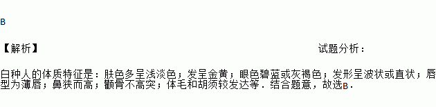 B 【解析】试题分析: 白种人的体质特征是:肤色多呈浅淡色;发呈金黄;眼色碧蓝或灰褐色;发形呈波状或直状;唇型为薄唇;鼻狭而高;颧骨不高突;体毛和胡须较发达等.结合题意,故选B.