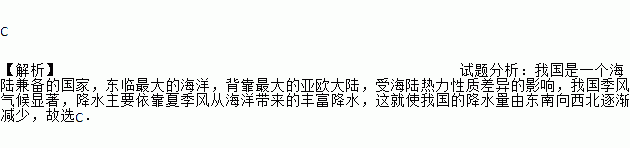 C 【解析】试题分析:我国是一个海陆兼备的国家,东临最大的海洋,背靠最大的亚欧大陆,受海陆热力性质差异的影响,我国季风气候显著,降水主要依靠夏季风从海洋带来的丰富降水,这就使我国的降水量由东南向西北逐渐减少,故选C.