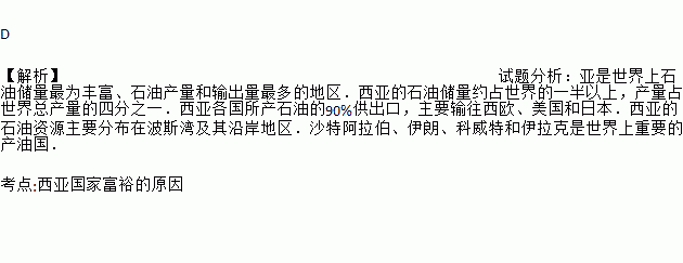 D ¡¾½âÎö¡¿ÊÔÌâ·ÖÎö£ºÑÇÊÇÊÀ½çÉÏʯÓÍ´¢Á¿×îΪ·á¸»¡¢Ê¯ÓͲúÁ¿ºÍÊä³öÁ¿×î¶àµÄµØÇø£®Î÷ÑǵÄʯÓÍ´¢Á¿Ô¼Õ¼ÊÀ½çµÄÒ»°ëÒÔÉÏ£¬²úÁ¿Õ¼ÊÀ½ç×ܲúÁ¿µÄËÄ·ÖÖ®Ò»£®Î÷ÑǸ÷¹úËù²úʯÓ͵Ä90%¹©³ö¿Ú£¬Ö÷ÒªÊäÍùÎ÷Å·¡¢ÃÀ¹úºÍÈÕ±¾£®Î÷ÑǵÄʯÓÍ×ÊÔ´Ö÷Òª·Ö²¼ÔÚ²¨Ë¹Íå¼°ÆäÑØ°¶µØÇø£®É³Ìذ¢À²®¡¢ÒÁÀÊ¡¢¿ÆÍþÌØºÍÒÁÀ¿ËÊÇÊÀ½çÉÏÖØÒªµÄ²úÓ͹ú£® ¿¼µã:Î÷Ñǹú¼Ò¸»Ô£µÄÔÒò
