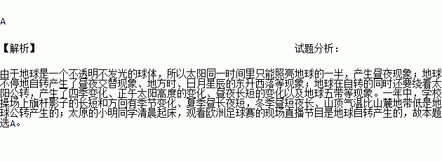 A. 太原的小明同学清晨起床,观看欧洲足球赛的现场直播节目