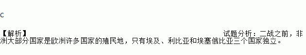 C 【解析】试题分析:二战之前,非洲大部分国家是欧洲许多国家的殖民地,只有埃及、利比亚和埃塞俄比亚三个国家独立。