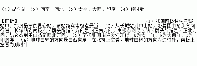 (1)昆仑站 (2)向南﹣向北 (3)太平;大西;印度 (4)顺时针 【解析】(1)我国南极科学考察站中,纬度最高的昆仑站,该站距离南极点最近.(2)从长城站到中山站,沿着图中箭头方向行进,长城站到南极点(箭头所指)方向是向正南方向,南极点到昆仑站(箭头所指是)正北方向,昆仑站到中山站是西北方向.(3)南极洲四周被大洋环绕,A为太平洋,B为大西洋,C为印度洋.(4)地球自转的方向是自西向东....