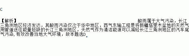 C 【解析】酸雨属于大气污染,长江三角洲地区经济发达,其酸雨污染仅次于华中地区,西气东输工程是将新疆塔里木盆地的天然气用管道送往能量短缺的长江三角洲地区,天然气作为清洁能源可以减轻长江三角洲地区的汽车尾气污染,有效改善当地大气环境,故本题选D。
