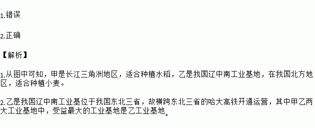 1.错误 2.正确 【解析】 1.从图中可知,甲是长江三角洲地区,适合种植水稻,乙是我国辽中南工业基地,在我国北方地区,适合种植小麦。 2.乙是我国辽中南工业基位于我国东北三省,故横跨东北三省的哈大高铁开通运营,其中甲乙两大工业基地中,受益最大的工业基地是乙工业基地。