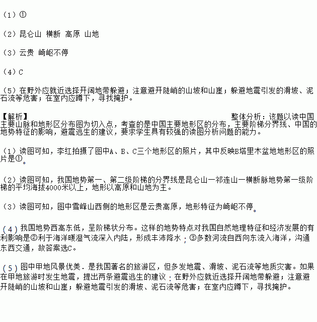 £¨1£©¢Ù £¨2£©À¥ÂØÉ½ ºá¶Ï ¸ßÔ É½µØ £¨3£©Ôƹó Æé᫲»Í£ £¨4£©C £¨5£©ÔÚÒ°ÍâÓ¦¾Í½üÑ¡Ôñ¿ªÀ«µØ´ø¶ã±Ü£»×¢Òâ±Ü¿ª¶¸Ç͵ÄɽÆÂºÍɽÑ£»¶ã±ÜµØÕðÒý·¢µÄ»¬ÆÂ¡¢ÄàʯÁ÷µÈΣº¦£»ÔÚÊÒÄÚÓ¦¶×Ï£¬Ñ°ÕÒÑÚ»¤¡£ ¡¾½âÎö¡¿ÕûÌå·ÖÎö£º¸ÃÌâÒÔ¶ÁÖйúÖ÷ҪɽÂöºÍµØÐÎÇø·Ö²¼Í¼ÎªÇÐÈëµã£¬¿¼²éµÄÊÇÖйúÖ÷ÒªµØÐÎÇøµÄ·Ö²¼£¬Ö÷Òª½×ÌÝ·Ö½çÏß¡¢ÖйúµÄµØÊÆÌØÕ÷µÄÓ°Ï죬±ÜÕðÌÓÉúµÄ½¨Ò飬ҪÇóѧÉú¾ßÓнÏÇ¿µÄ¶Áͼ·ÖÎöÎÊ...