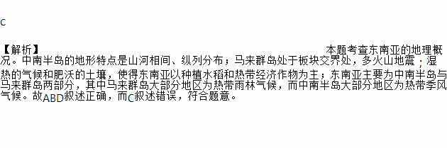 C ¡¾½âÎö¡¿±¾Ì⿼²é¶«ÄÏÑǵĵØÀí¸Å¿ö¡£ÖÐÄϰ뵺µÄµØÐÎÌØµãÊÇɽºÓÏà¼ä¡¢×ÝÁзֲ¼£»ÂíÀ´Èºµº´¦ÓÚ°å¿é½»½ç´¦£¬¶à»ðɽµØÕð£»ÊªÈÈµÄÆøºòºÍ·ÊÎÖµÄÍÁÈÀ£¬Ê¹µÃ¶«ÄÏÑÇÒÔÖÖֲˮµ¾ºÍÈÈ´ø¾¼Ã×÷ÎïΪÖ÷£»¶«ÄÏÑÇÖ÷ҪΪÖÐÄϰ뵺ÓëÂíÀ´ÈºµºÁ½²¿·Ö£¬ÆäÖÐÂíÀ´Èºµº´ó²¿·ÖµØÇøÎªÈÈ´øÓêÁÖÆøºò£¬¶øÖÐÄϰ뵺´ó²¿·ÖµØÇøÎªÈÈ´ø¼¾·çÆøºò¡£¹ÊABDÐðÊöÕýÈ·£¬¶øCÐðÊö´íÎ󣬷ûºÏÌâÒâ¡£