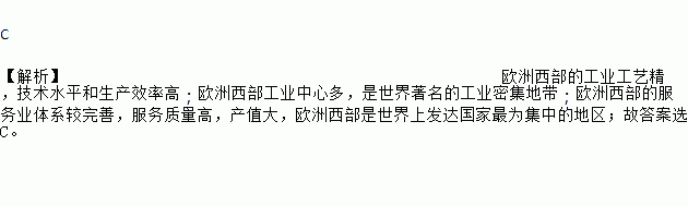 C 【解析】欧洲西部的工业工艺精,技术水平和生产效率高;欧洲西部工业中心多,是世界著名的工业密集地带;欧洲西部的服务业体系较完善,服务质量高,产值大,欧洲西部是世界上发达国家最为集中的地区;故答案选C。