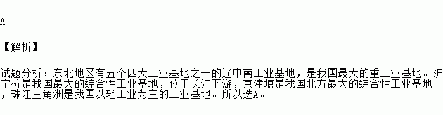 A 【解析】 试题分析:东北地区有五个四大工业基地之一的辽中南工业基地,是我国最大的重工业基地。沪宁杭是我国最大的综合性工业基地,位于长江下游,京津塘是我国北方最大的综合性工业基地,珠江三角洲是我国以轻工业为主的工业基地。所以选A。
