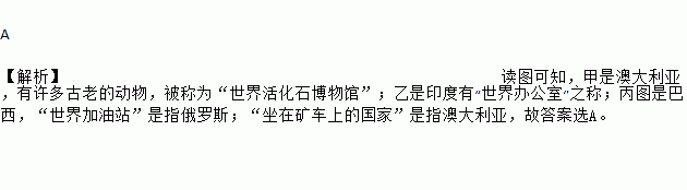 A ¡¾½âÎö¡¿¶Áͼ¿ÉÖª£¬¼×ÊǰĴóÀûÑÇ£¬ÓÐÐí¶à¹ÅÀϵ͝Î±»³ÆÎª¡°ÊÀ½ç»î»¯Ê¯²©Îï¹Ý¡±£»ÒÒÊÇÓ¡¶ÈÓС°ÊÀ½ç°ì¹«ÊÒ¡±Ö®³Æ£»±ûͼÊǰÍÎ÷£¬¡°ÊÀ½ç¼ÓÓÍÕ¾¡±ÊÇÖ¸¶íÂÞ˹£»¡°×øÔÚ¿ó³µÉϵĹú¼Ò¡±ÊÇÖ¸°Ä´óÀûÑÇ£¬¹Ê´ð°¸Ñ¡A¡£