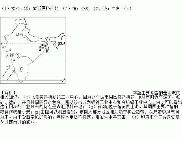(1)孟买;煤;靠近原料产地 (2)恒;小麦 (3)热;西南 (4) 【解析】本题主要考查的是印度的相关知识。(1)A孟买是棉纺织工业中心,因为这个城市周围盛产棉花,B城市附近有煤矿、铁矿、锰矿,并且其周围盛产黄麻,所以该市成为钢铁工业中心和麻纺织工业中心。由此可以看出这个国家的工业分布的特点是靠近原料产地;(2)首都D位于恒河的上游,其周围主要种植的粮食作物是小麦;(3 )由图可以明显看出...