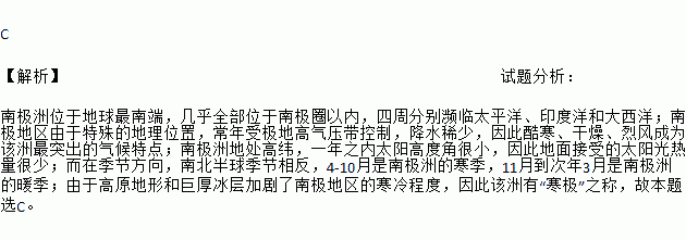 C 【解析】试题分析: 南极洲位于地球最南端,几乎全部位于南极圈以内,四周分别濒临太平洋、印度洋和大西洋;南极地区由于特殊的地理位置,常年受极地高气压带控制,降水稀少,因此酷寒、干燥、烈风成为该洲最突出的气候特点;南极洲地处高纬,一年之内太阳高度角很小,因此地面接受的太阳光热量很少;而在季节方向,南北半球季节相反,4-10月是南极洲的寒季,11月到次年3月是南极洲的暖季;由于高原地形和...