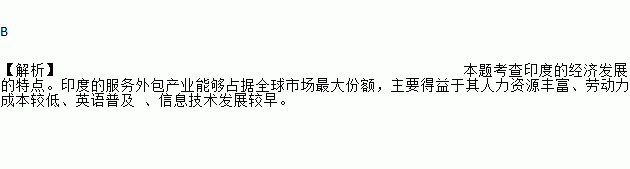 B 【解析】 本题考查印度的经济发展的特点。印度的服务外包产业能够占据全球市场最大份额,主要得益于其人力资源丰富、劳动力成本较低、英语普及 、信息技术发展较早。