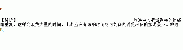 B 【解析】旅游中应尽量避免的是线路重复,这样会浪费大量的时间,出游应在有限的时间尽可能多的游览较多的旅游景点。故选B。