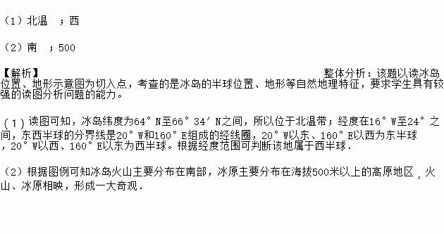 (1)北温;西 (2)南;500 【解析】整体分析:该题以读冰岛位置、地形示意图为切入点,考查的是冰岛的半球位置、地形等自然地理特征,要求学生具有较强的读图分析问题的能力。 (1)读图可知,冰岛纬度为64°N至66°34′N之间,所以位于北温带;经度在16°W至24°之间,东西半球的分界线是20°W和160°E组成的经线圈,20°W以东、160°E以西为东半球,20°W以西、...